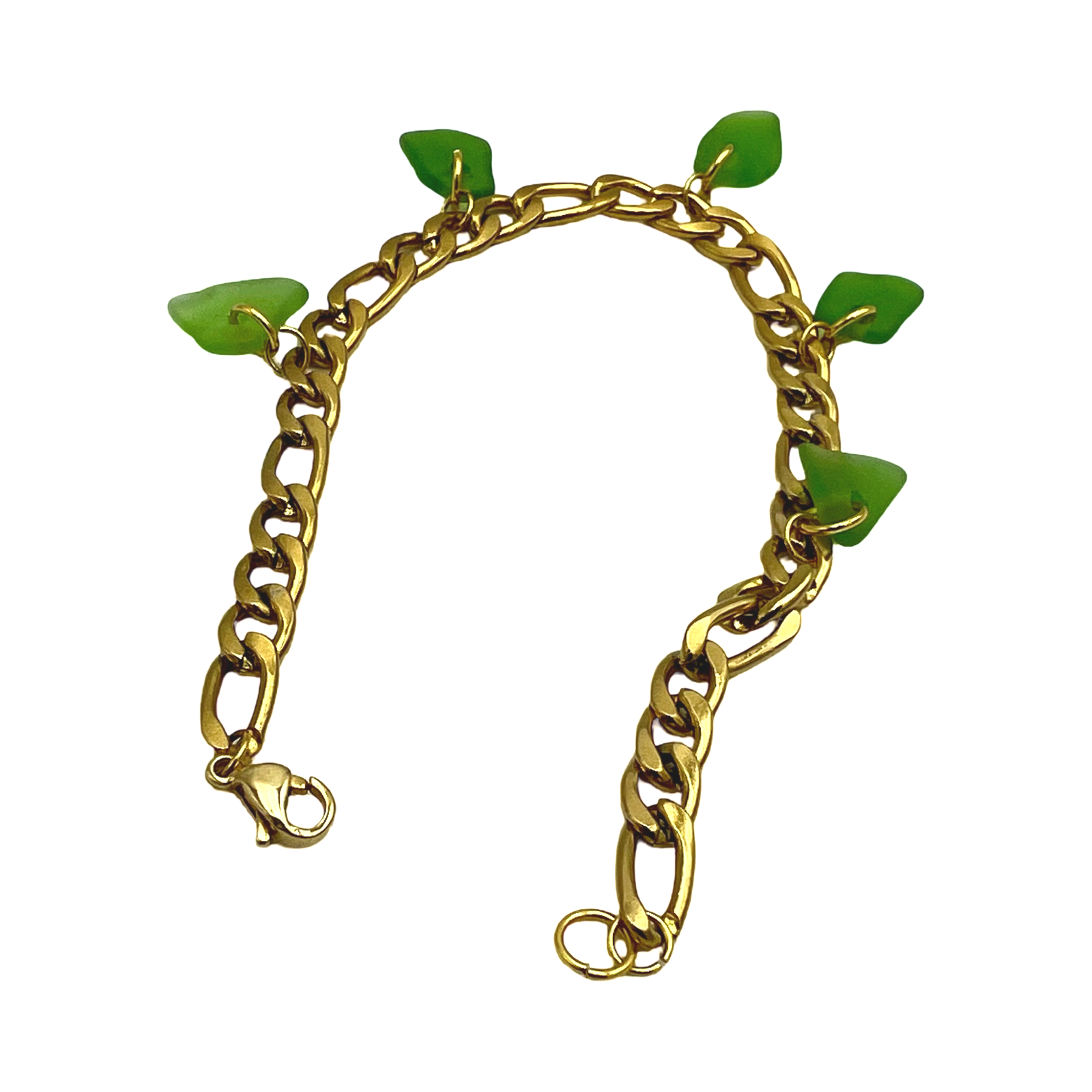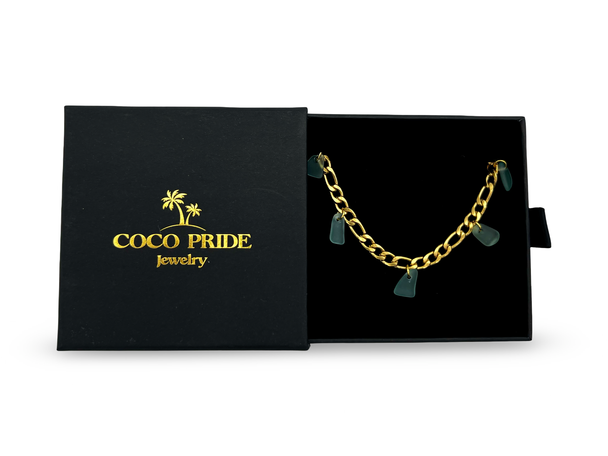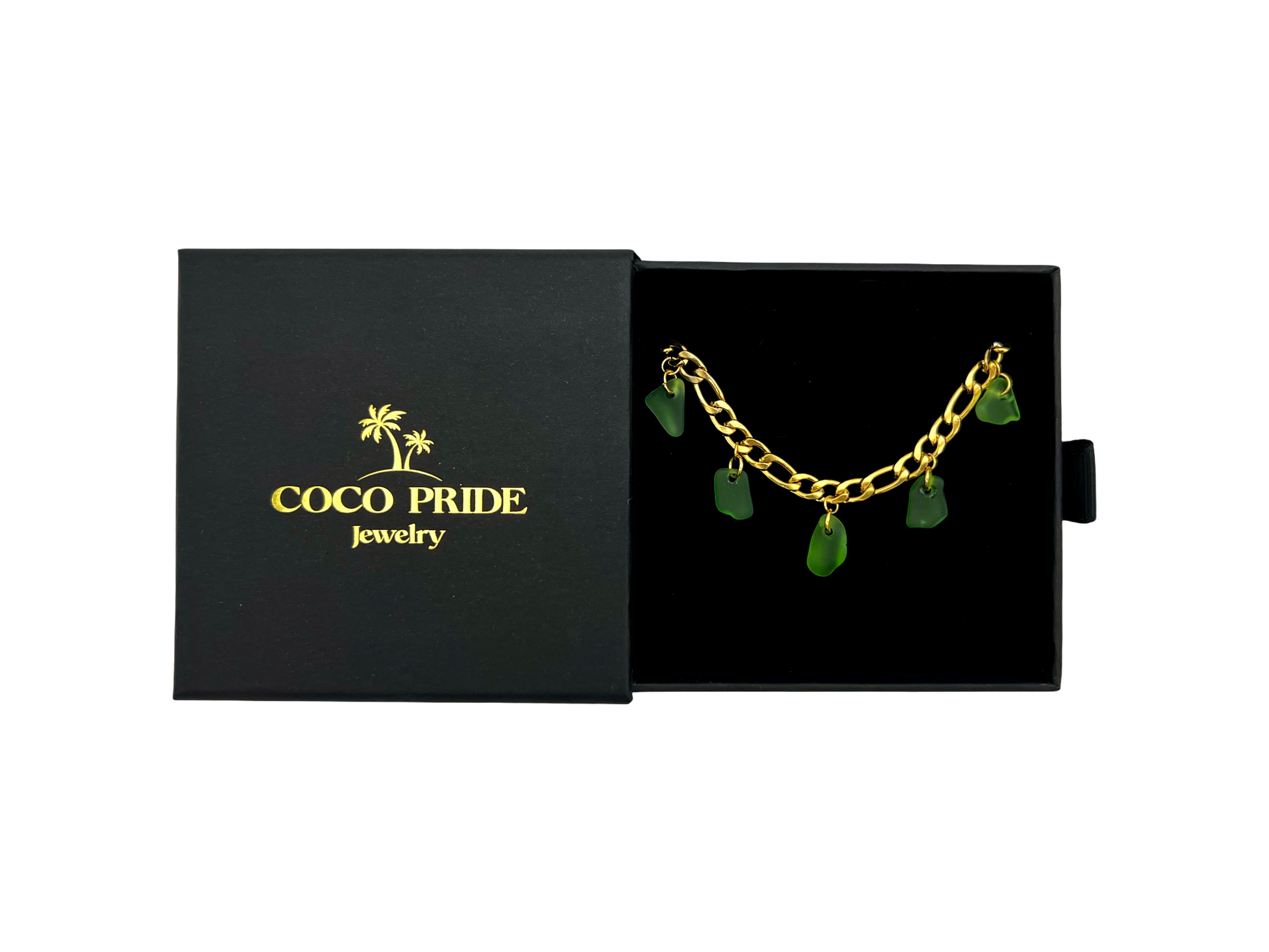 The Sea Glass Bracelet features five pieces of authentic green or blue Hawaiian sea glass, each naturally smoothed by the ocean. No two pieces are ever the same, making every bracelet its own unique treasure.✨