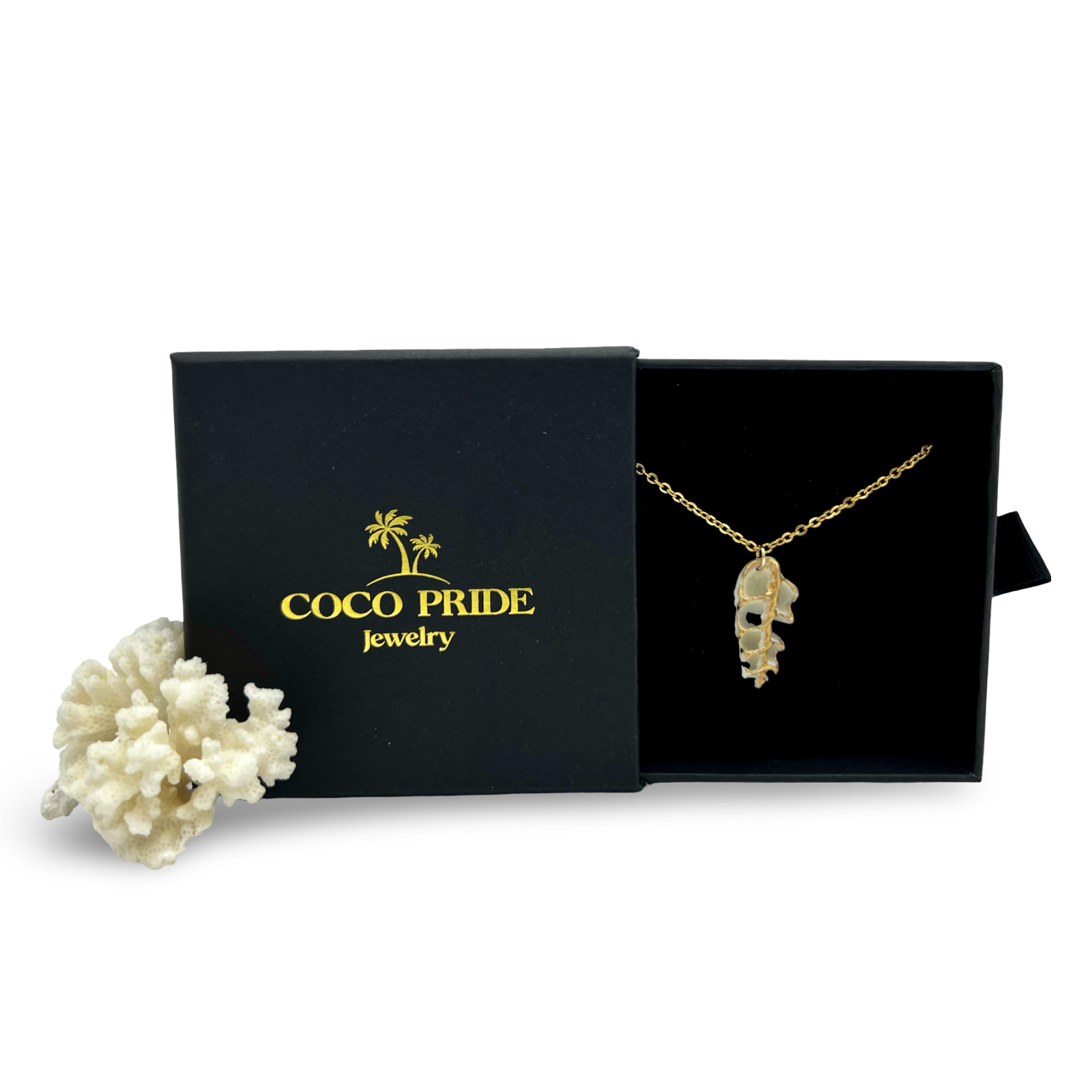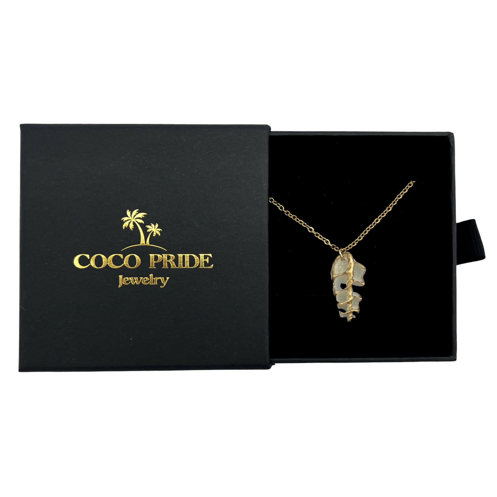The Golden Skeleton Necklace features an authentic skeleton cone shell worn smooth by time and tides—a rare treasure that reflects the ocean’s power to transform.