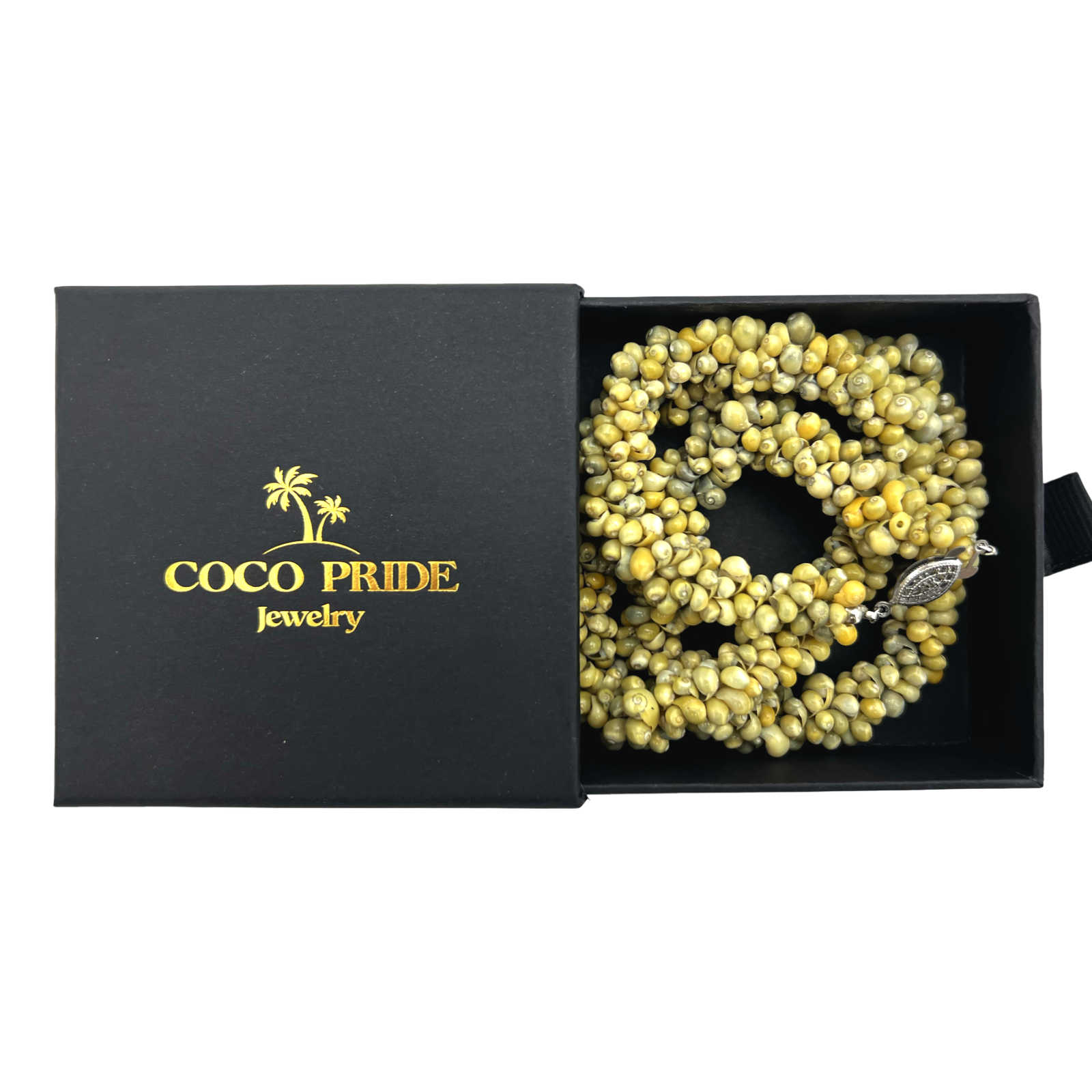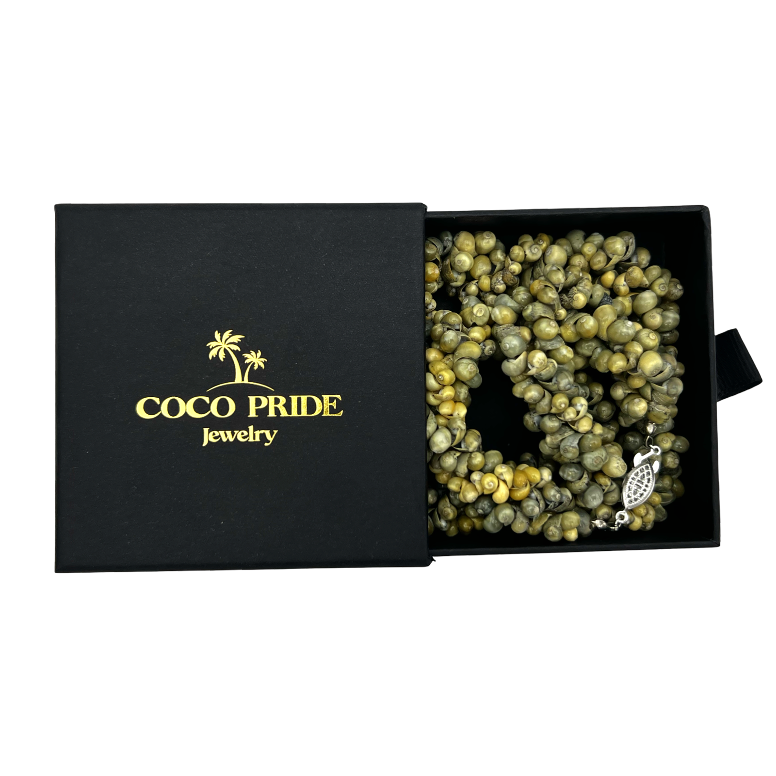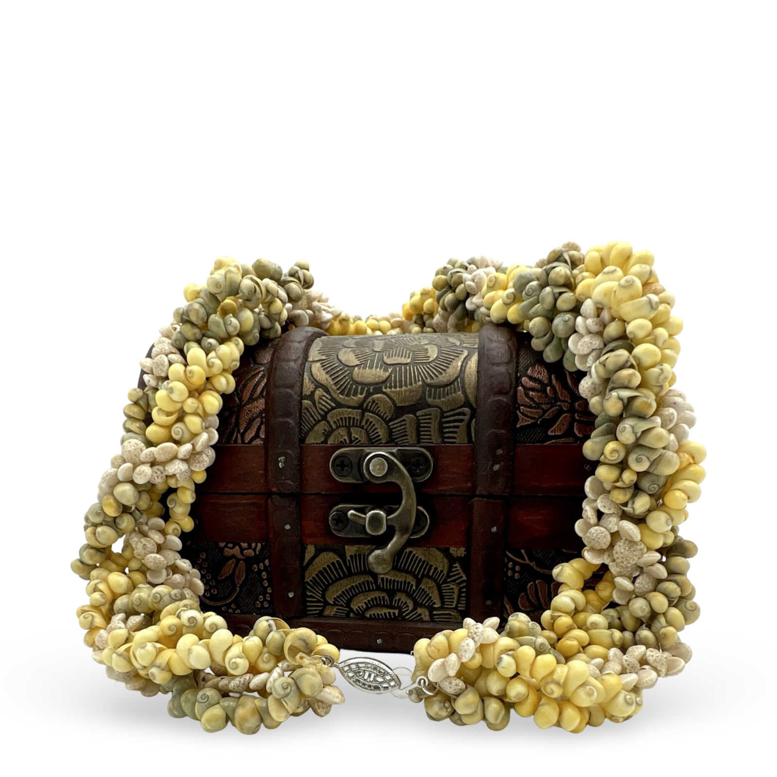 The Island Vibes Necklace embodies the raw beauty of Coco Island’s natural shores — where sun, sea, and stone meet. Each strand is hand-strung with real shells in soft gray, green, cream, and golden tones.