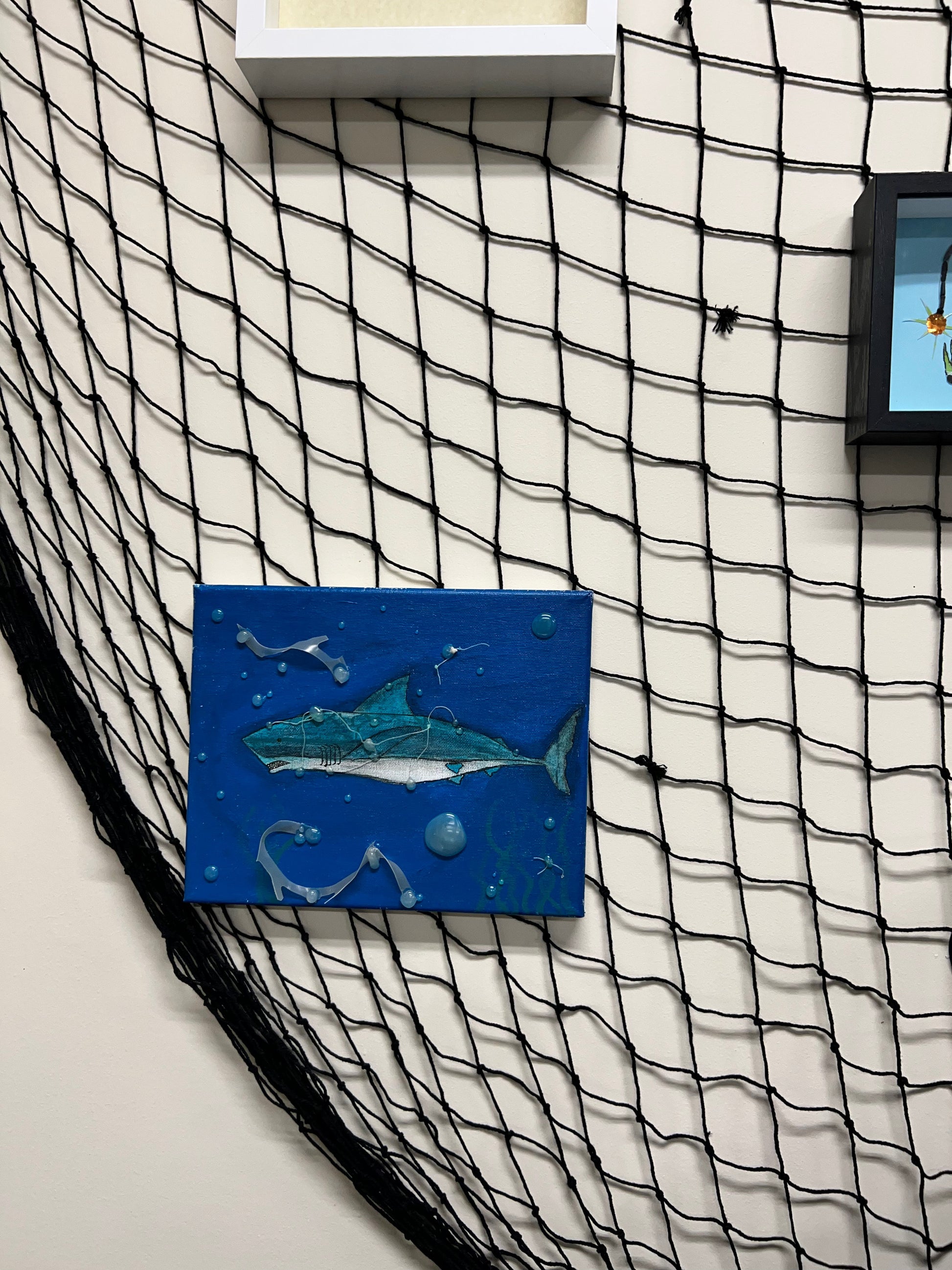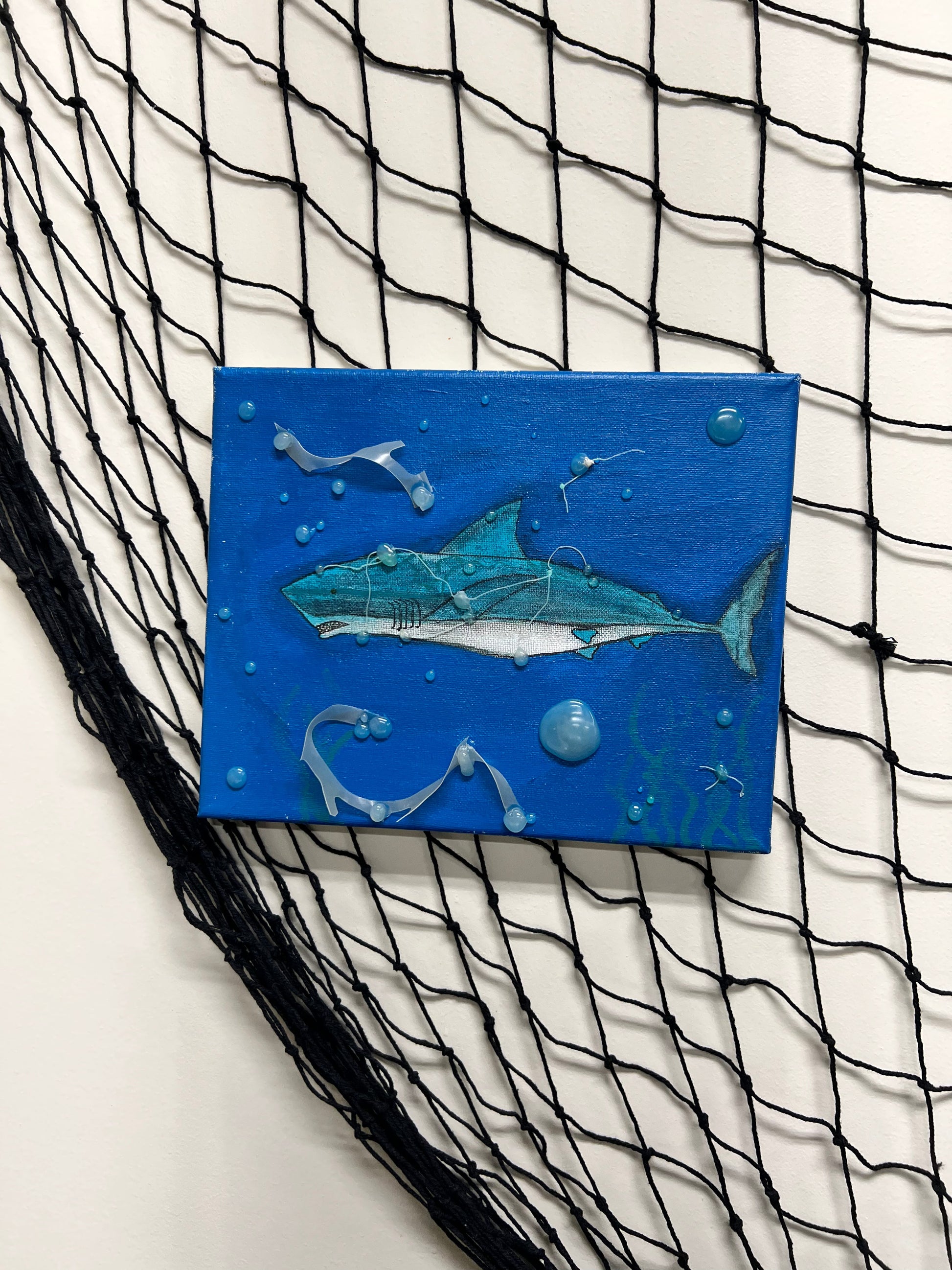 A powerful 8x10 canvas featuring a hand-painted shark entangled in real marine debris collected during BEBETTER’s monthly beach cleanups. Set against a deep blue background, the artwork blends beauty with urgency—symbolizing the very real dangers marine life faces every day.
