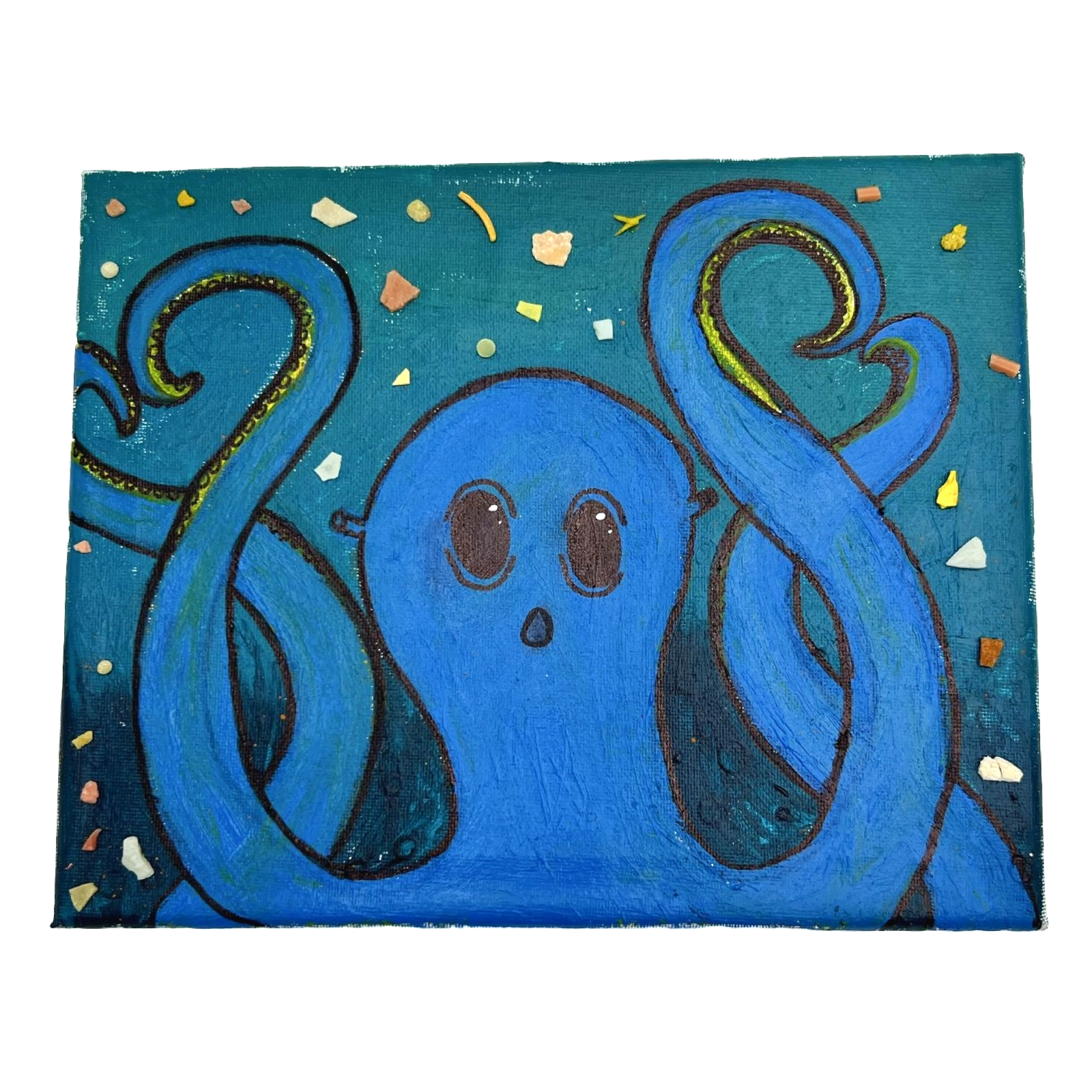 A wide-eyed octopus painted on an 8x10 canvas, surrounded by real microplastics collected during BEBETTER’s monthly beach cleanups. Frozen in a moment of confusion and concern, the octopus is set against a gradient ocean backdrop in this mixed-media piece that highlights the invisible threat polluting our seas.
